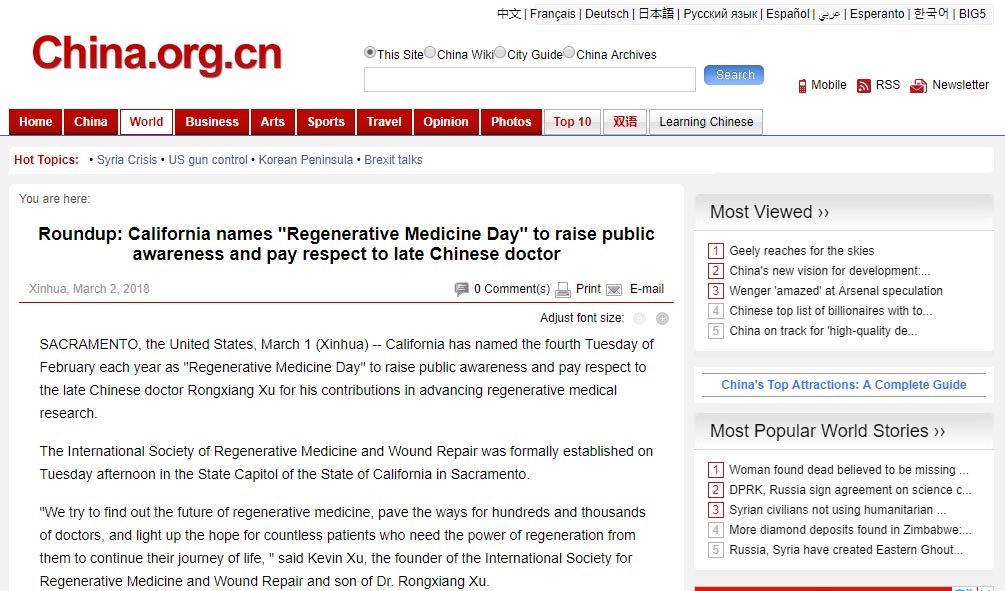 美國設立“再生醫(yī)學日”致敬已故的中國醫(yī)生