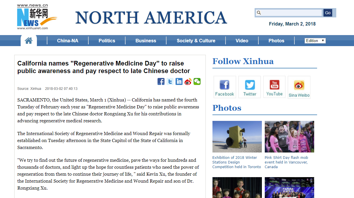 新華網:美國設立“再生醫(yī)學日”致敬已故的中國醫(yī)生