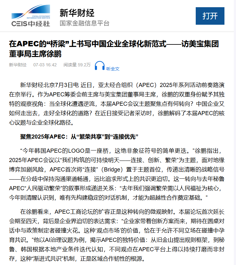 新華財經(jīng):在APEC“橋梁”上書寫中國企業(yè)全球化新范式—訪美寶集團董事局主席徐鵬