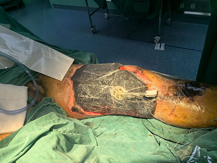 10月10日,應(yīng)長(zhǎng)治市人民醫(yī)院急診邀請(qǐng),《中國(guó)燒傷創(chuàng)瘍雜志》常務(wù)編委、燒傷創(chuàng)瘍?cè)偕t(yī)療技術(shù)臨床專家趙瑞慶,會(huì)診一例裝載機(jī)碾軋傷工人。次日在全麻下行雙下肢大腿內(nèi)側(cè),外側(cè)壞死組織清創(chuàng)術(shù),事后使用vsd裝置,術(shù)后制定了詳細(xì)的治療方案。